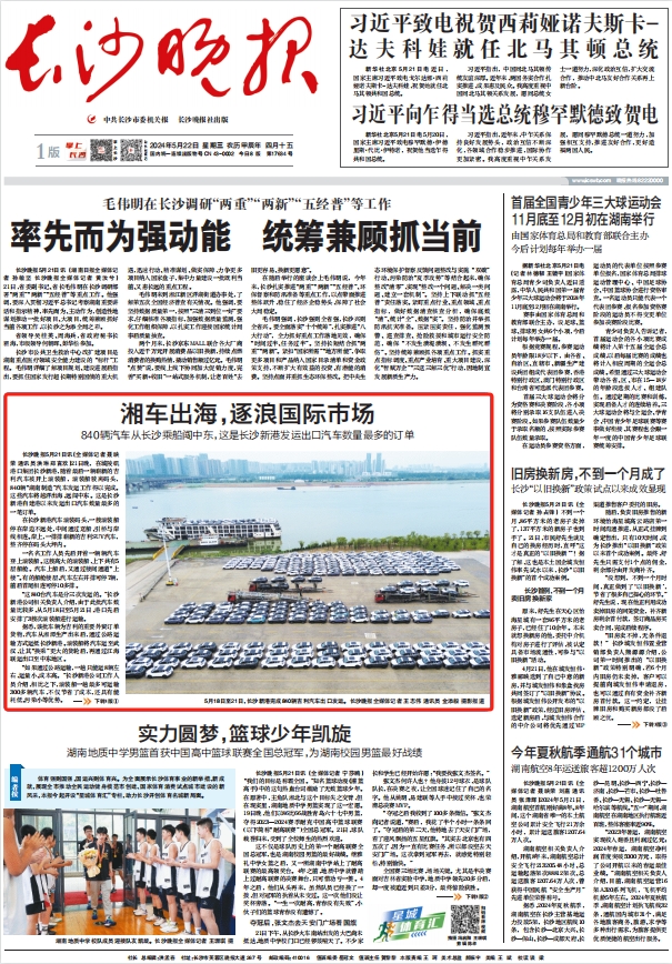 《長(zhǎng)沙晚報(bào)》(2024年5月22日 第一版) 湘車出海,逐浪國際市場(chǎng)840輛汽車從長(zhǎng)沙乘船闖中東,這是長(zhǎng)沙新港發(fā)運(yùn)出口汽車數(shù)量最多的訂單